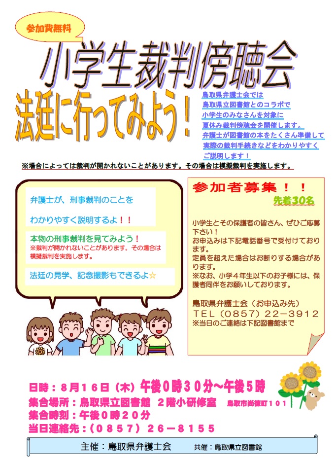 鳥取県弁護士会では,鳥取県立図書館とのコラボで小学生のみなさんを対象に夏休み裁判傍聴会を開催します。
