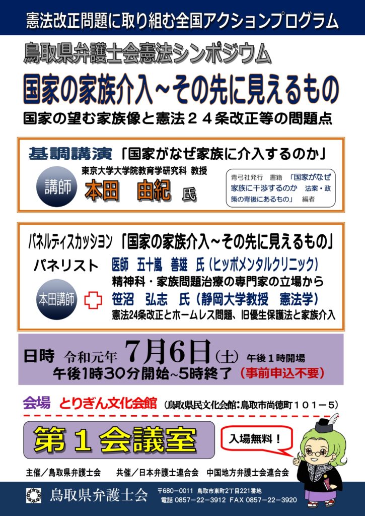 鳥取県弁護士会では,「国家の家族介入~その先に見えるもの~」と題しまして憲法シンポジウムを開催します。