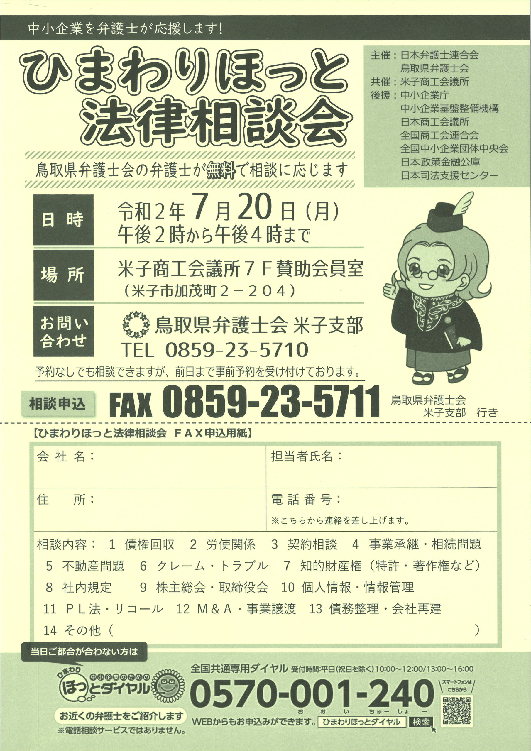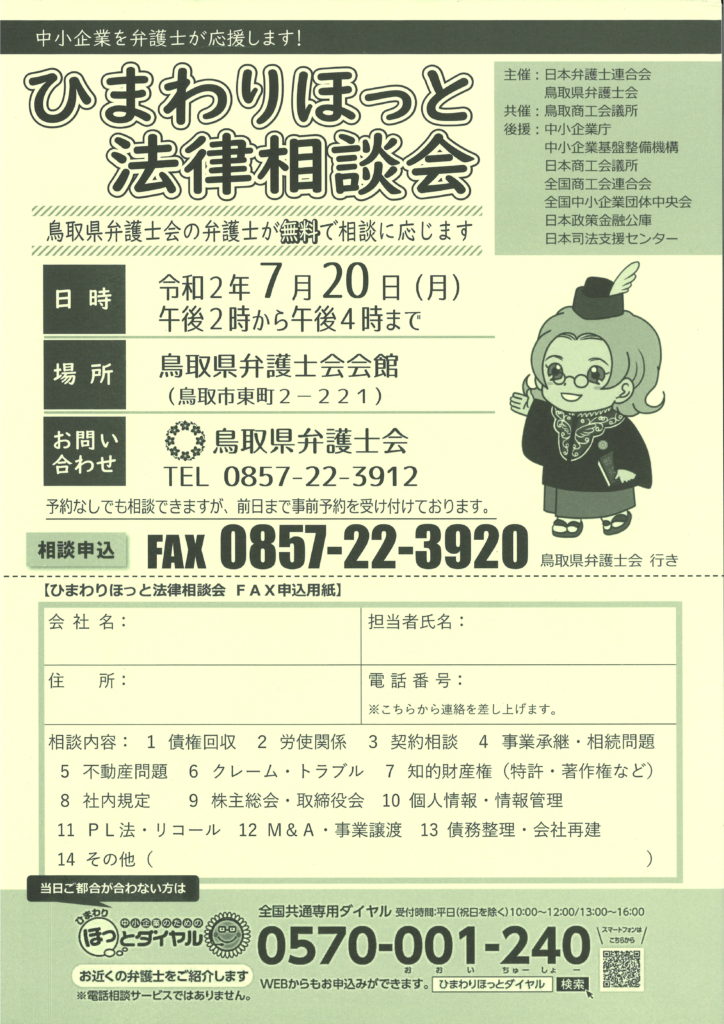 7月20日14時~16時まで,中小企業からの法律相談に,鳥取県内の弁護士が無料で対応します。
