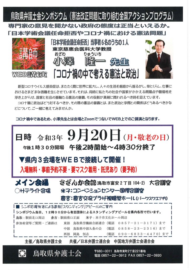 鳥取県弁護士会では,菅首相によって日本学術会議会員への任命を拒否された東京慈恵会医科大学の小澤隆一教授に日本学術会議任命拒否問題やコロナ禍の下での様々な問題について,憲法の視点からお話いただくシンポジウムを開催することと致しました。