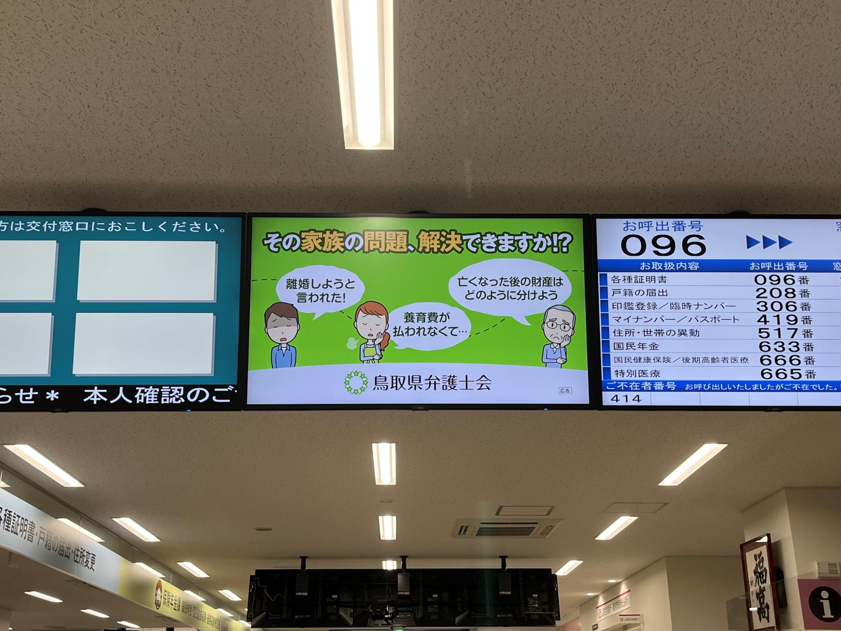 先月から、鳥取市役所と米子市役所で当会の広告の放映が始まっていましたが、令和4年3月1日より、倉吉市役所での放映も開始しました。