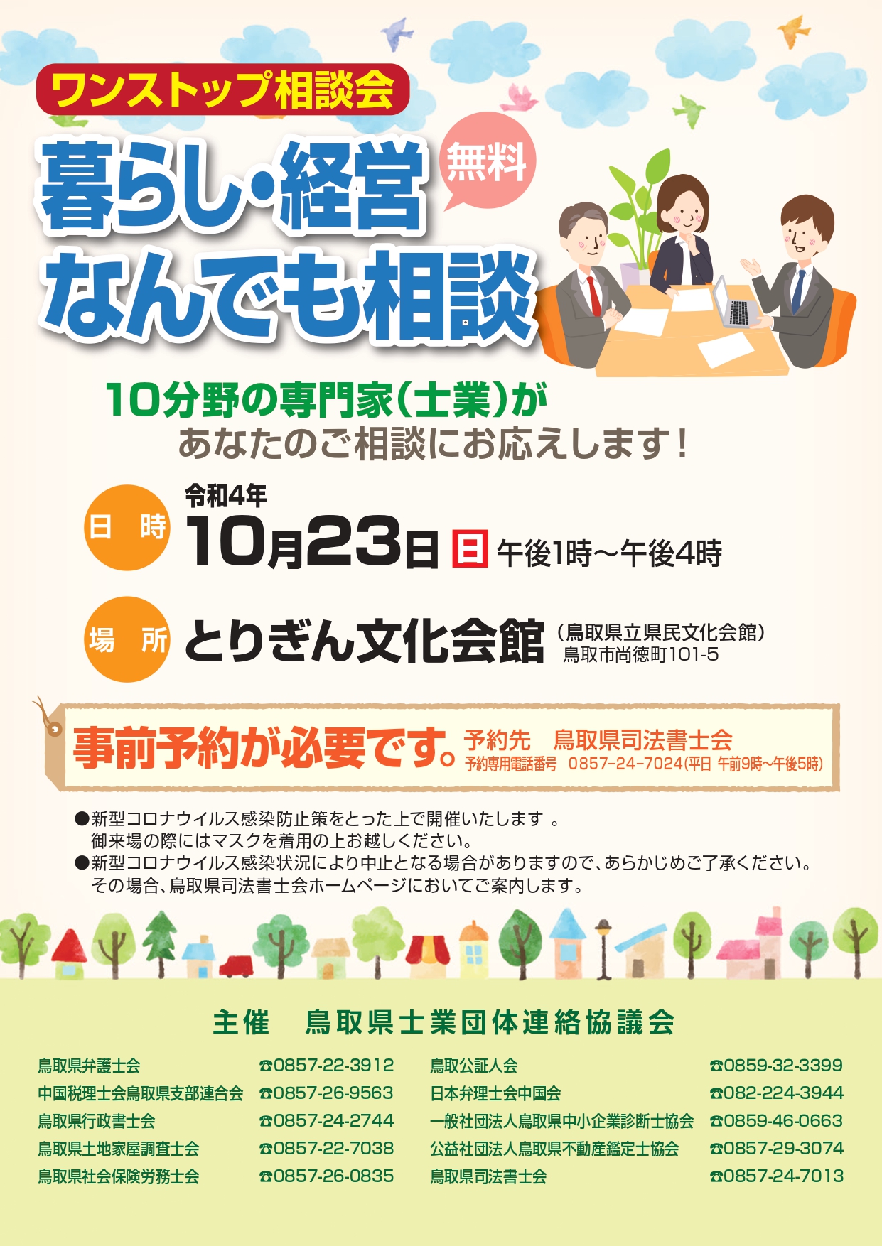 鳥取県内の弁護士、税理士、行政書士、土地家屋調査士、社会保険労務士、司法書士、公証人、弁理士、中小企業診断士、不動産鑑定士の10分野の専門家(士業)が、皆さまの暮らし・経営にかかわる相談に無料でお応えします。