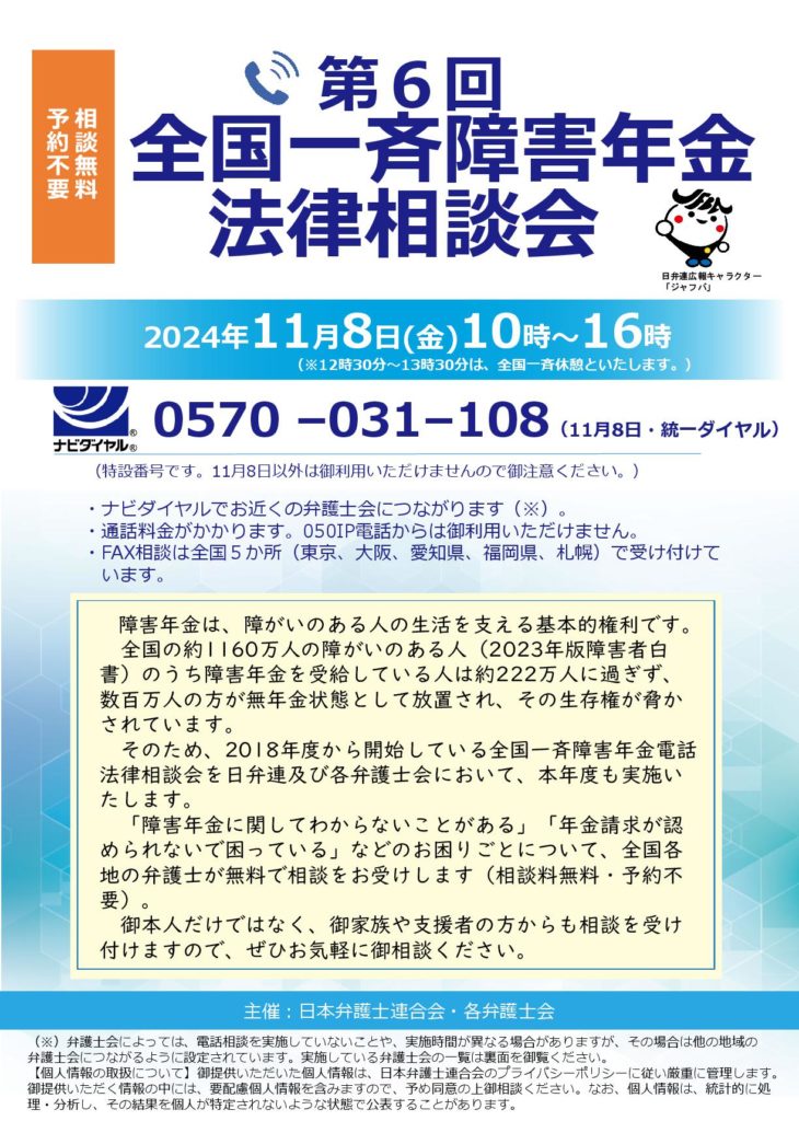そこで、日弁連及び鳥取県弁護士会においては、本年度も、「全国一斉障害年金法律相談会」を実施いたします。