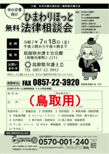 7月18日14時~16時まで、中小企業からの法律相談に、鳥取県内の弁護士が無料で対応します。