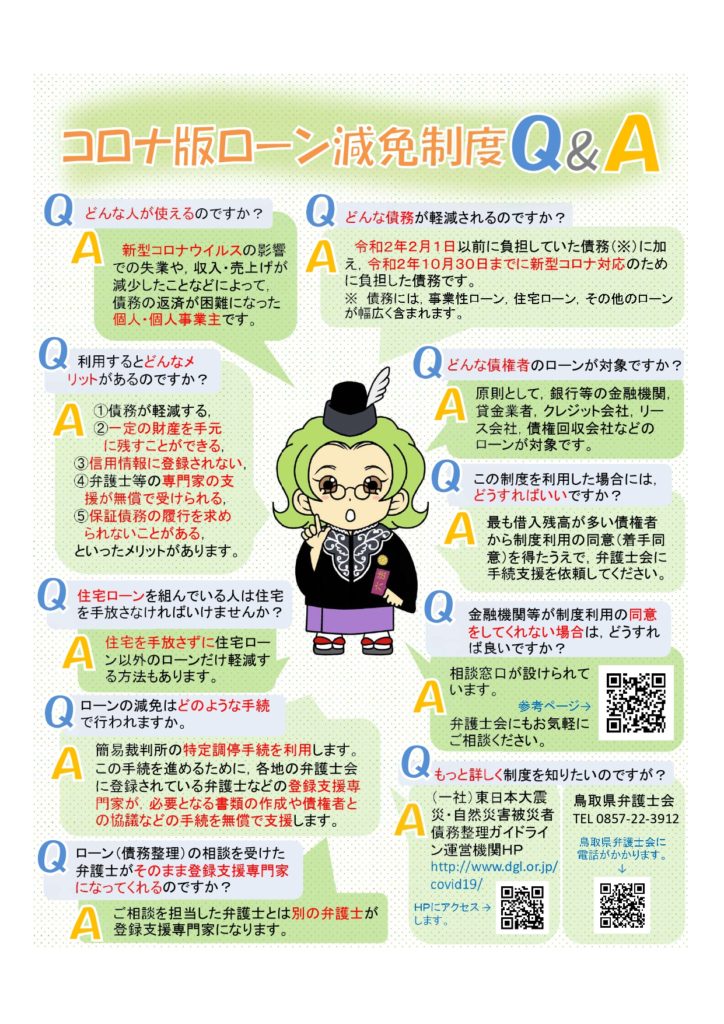 コロナ版ローン減免制度については、本来の自然災害の場合との細かい利用要件等の違いがありますので、内容についての疑問点は弁護士にご相談下さい。また、ガイドラインに基づくローン減免制度全体に関するその他のお問い合わせにつきましても、同様に弁護士にご相談ください。